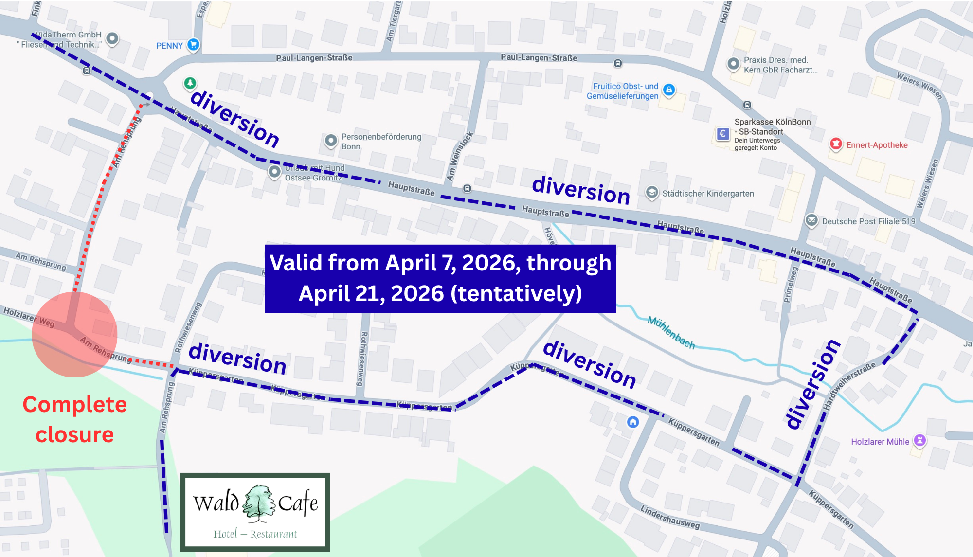 From April 7 through April 21, 2026 (tentative), the intersection of Holzlarer Weg and Am Rehsprung will be closed, making regular access to the Waldcafé impossible. The detour will run along Hauptstraße, Hardweiherstraße, and Küppersgarten.
